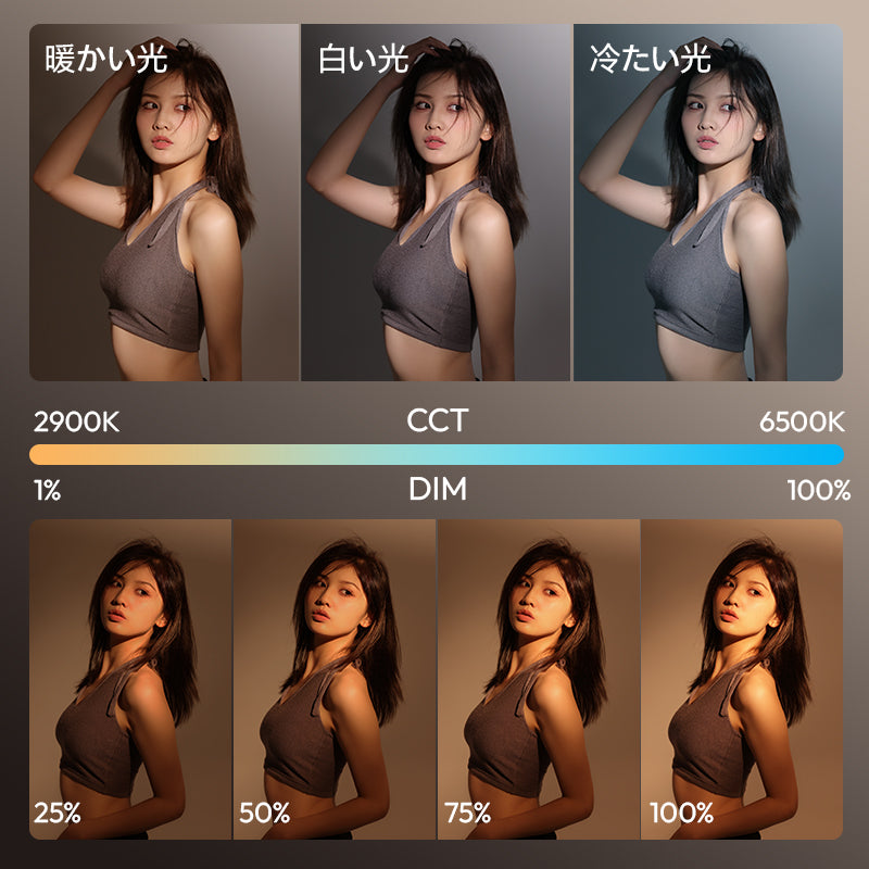 2900Kから6500K まで無段階に調整して完璧な照明に調整し、必要に応じて暖色または寒色の雰囲気を作り出します。