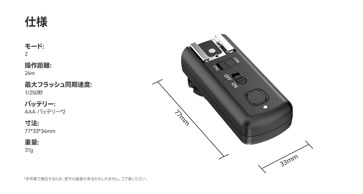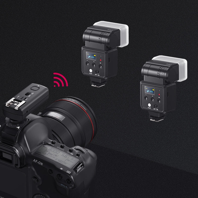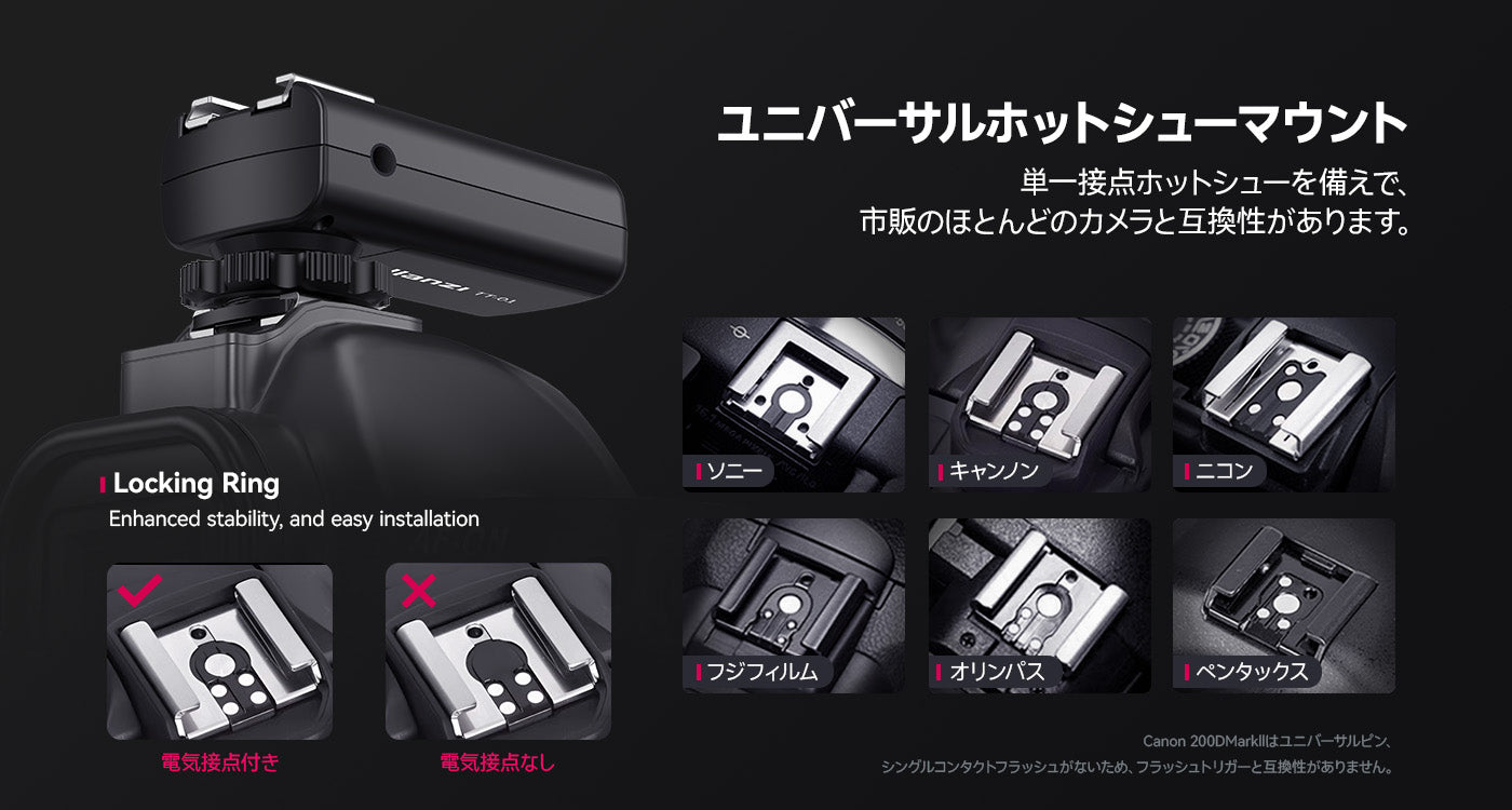 トリガーをカメラのホットシューに取り付けると、単接点フラッシュが同時にトリガーされ、フラッシュの同期が保証されます。※ホットシューコネクタに搭載されたフラッシュを単独で使用する場合は、フラッシュモードを設定する必要はありません。カメラのモデルやチャンネルの制限はありません。
