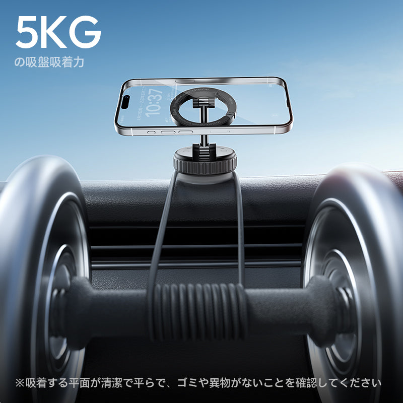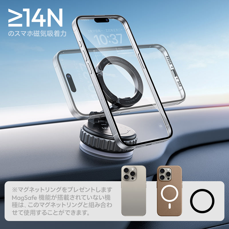 N52高磁力マグネットを採用し、吸着力≥14Nで超強力な固定力を実現!MagSafe 位置合わせ機能があるので、スマホを近づけるだけで 1 秒で強固に装着。縦横画面の切り替えも気軽にでき、見たい角度で使える。悪路の振動にも負けず、ズレることがないので、ドライブ中も安心してナビや動画視聴が楽しめる。