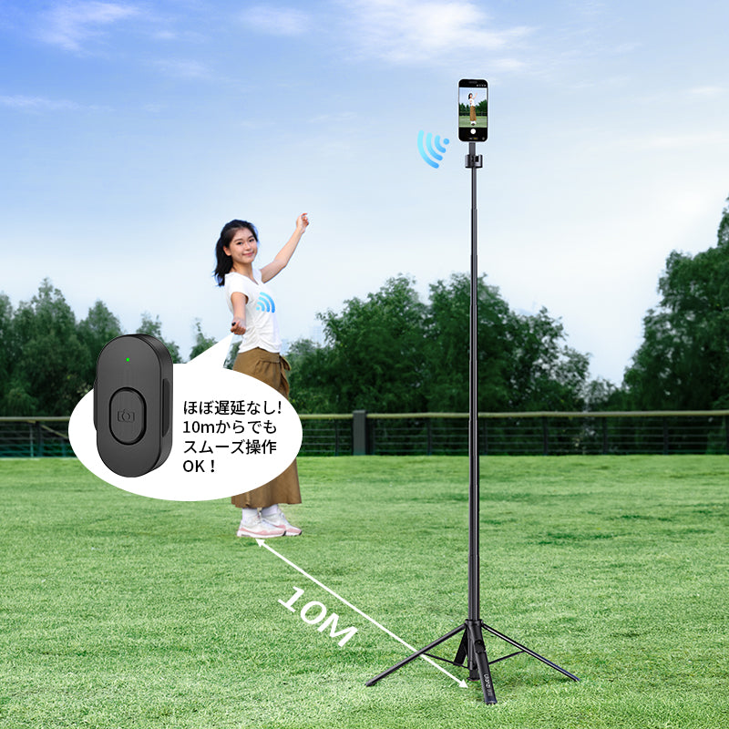 8 段伸縮構造で長さを自在に調整でき、最短から全伸展 180cm まで、シーンに合わせて柔軟に対応します。一人旅の全身セルフィーはもちろん、家族や友人との多人数記念写真も、後ろ姿を残すことなく全員をバッチリ収めることができます。