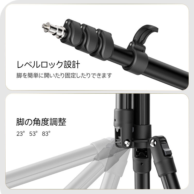 5セクションのセンターコラムと2セクションの脚を備えたこのライトスタンドには、柔軟な照明設定を可能にするクイックリリースレベルロックが付属しています。