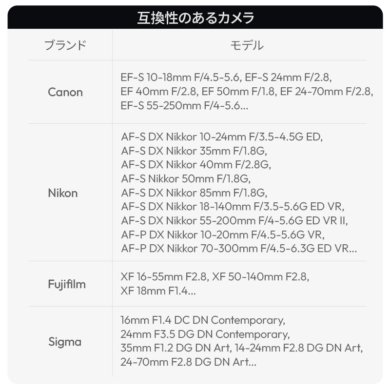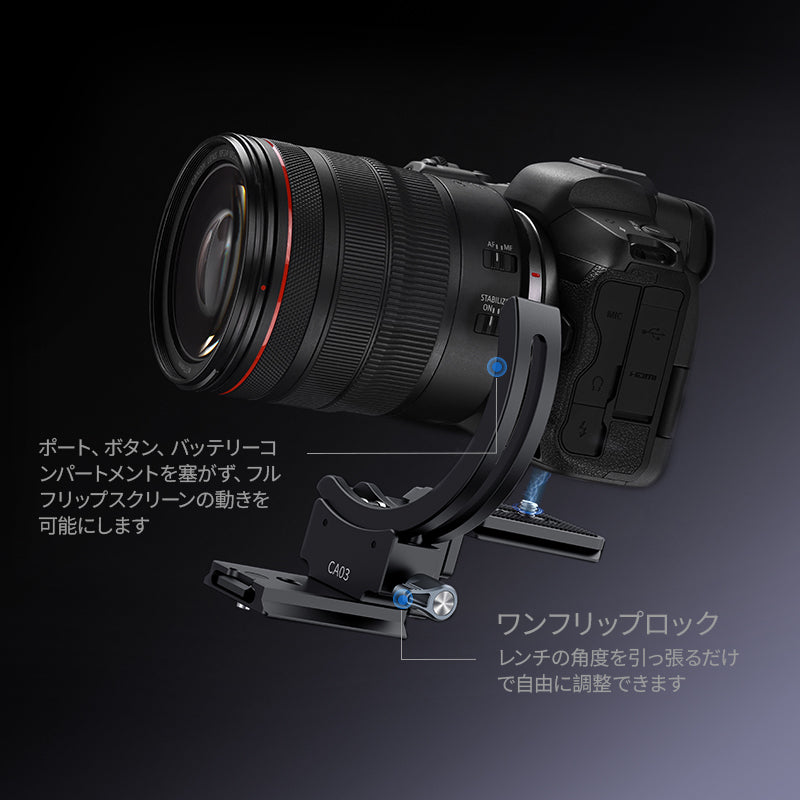 • 2. Cブラケット設計:レンズを取り外すことなく、簡単に取り付けられ、ほとんどのカメラやレンズと互換性があります。(Canon/Sony/Fujifilm/Nikon/Sigmaなど)。