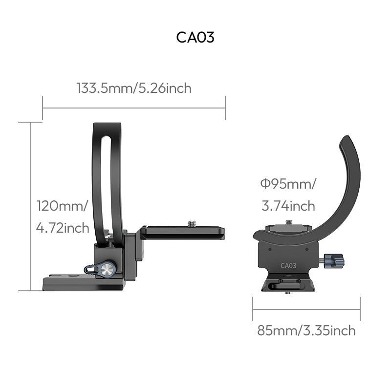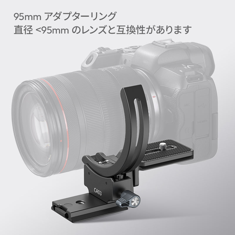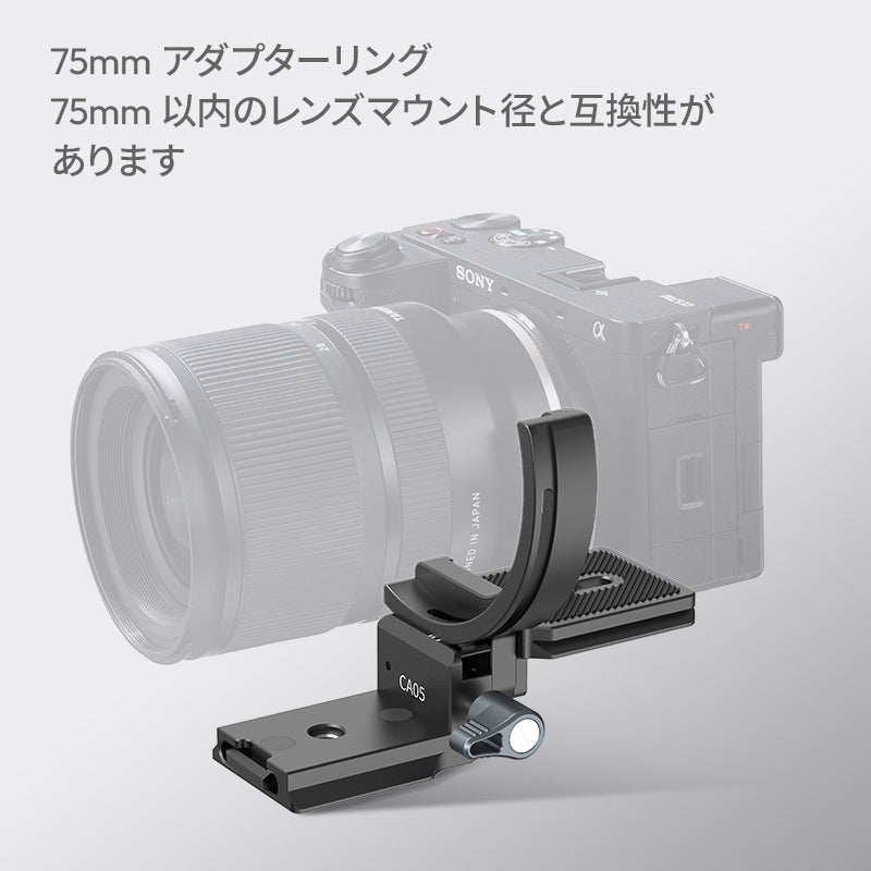 C字型のデザインにより、レンズを取り外さずに取り付けることができ、直径95mm以下のカメラとレンズに対応可能です。