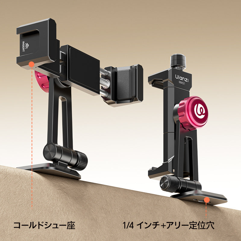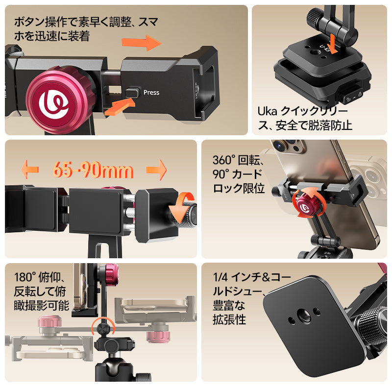 スマホクリップの挟持範囲は 65-90mm に設計され、「通常調整」と「大サイズ機種用調整」の 2 種類の方式を搭載。