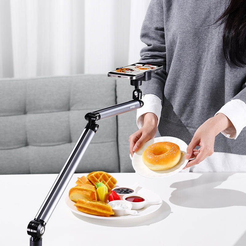 Ulanzi TH07調整可能なスマートフォンフロアスタンドは、携帯電話でビデオを撮影したり録画したりするための多目的で丈夫な解決策です。オーバーヘッドデザインにより、安定したハンズフリーの体験が可能であり、また、簡単に調整および移動できます。簡単にプロフェッショナルなビデオを作成できます。