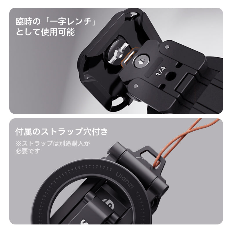 ベースは Uka クイックマウント・アルカクイックマウントに両対応し、1/4 インチアレイ定位孔を装備。オフィスのプレゼン撮影ではマジックアームに接続して補助レンズを追加、屋外のスポーツ中継では三脚と組み合わせて機器安定性を高め、日常の Vlog 録画では単体でスタンドとして使用するなど、様々なシーンの撮影ニーズに応え、拡張性を最大化します。