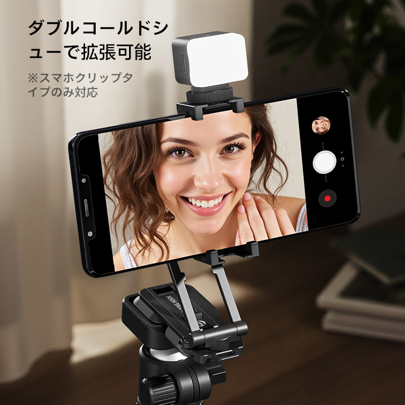 ダブルクールシュー拡張(スマホクランプ款のみ対応):暗い室内や夕暮れの撮影では補助 LED ライトを接続して明るさを補い、Vlog 録画やインタビュー時には指向性マイクを追加して音質を向上でき、高品質な撮影環境を簡単に構築できます。
