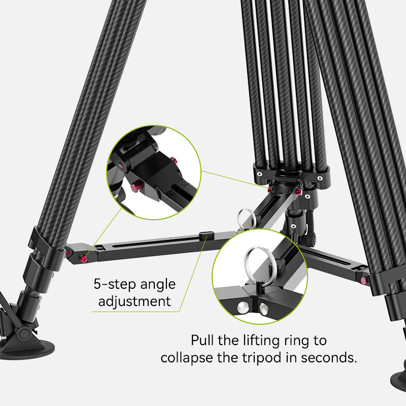 VideoFastは、安定性を重視した5段チューブと広めに設計されたジョイント部により、さまざまな撮影環境で高い安定性を発揮します。軽量かつ強靭な三脚は、最大55インチ(25kg)まで支えることができ、幅広い撮影機材や長時間のレンズ操作をサポートします。折りたたむと34.8インチ(88.6cm)になり、付属のバッグを使用すれば、屋外での旅行ビデオ撮影に最適です。