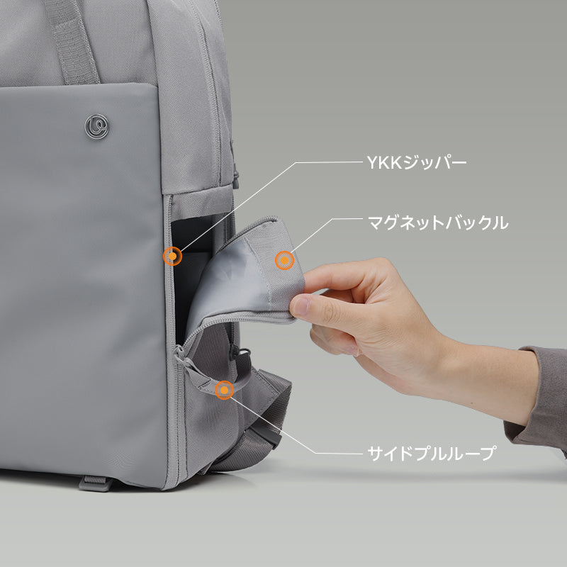 普段使いできるようなデザインで、バックパックやクロスボディバッグ、スリングバッグ、手持ちなどの複数の持ち運びオプションがあります。