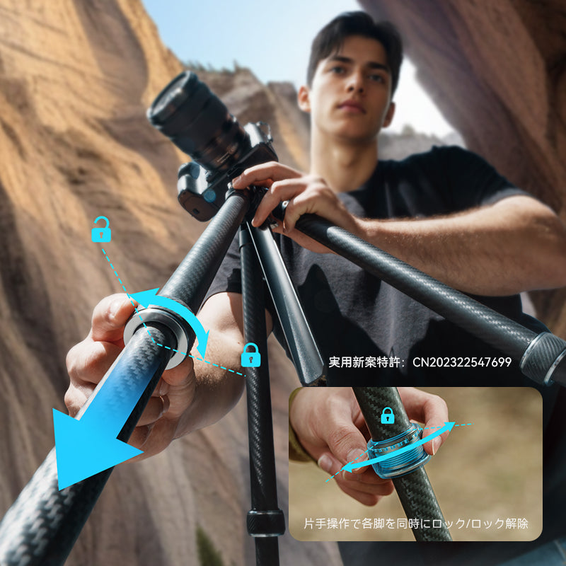 革新的な1/3制限クイックロック設計:片手で約1/3回転回すだけですべての脚セクションが瞬時に解放され、スムーズなセットアップと瞬時の展開が可能です。