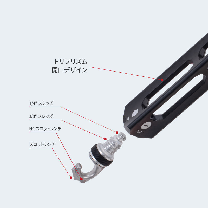 多機能フックにはマイナス/六角ドライバーが付いており、バックパックやウォーターボトルのハンガーとしても使用できます。1/4インチと3/8インチのネジが付属し、長いセンターコラムと短いセンターコラムの両方をサポートします。構造力学からヒントを得たトライプリズムデザインは、剛性を確保しながら重量を減らして使いやすく なります。