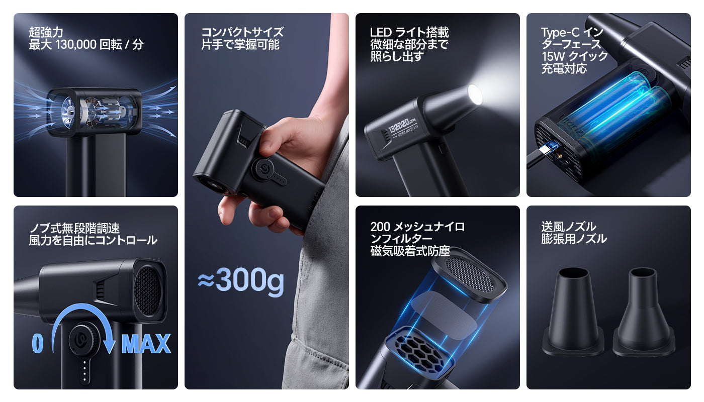 約 300g の軽さと 71mm×125mm(通常のスマホサイズよりコンパクト)のサイズで、撮影の現場でカバンに小さく収納してレンズ除塵に即対応でき、家庭では片手で持ちながらキーボードの細かい隙間を掃除でき、アウトドアキャンプ時にもバッグに嵩張ることなく入れてすぐ使えるため、どのシーンでも軽装で便利に活用できます。