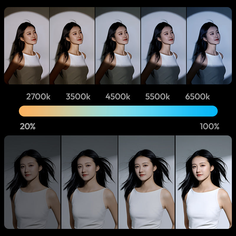 2700K-6500K の広範囲の二色温度に対応、ノブで無段階調光を実現し、千変万化の光と影の雰囲気を作り出します。