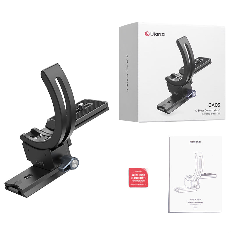 C字型のデザインにより、レンズを取り外さずに取り付けることができ、直径95mm以下のカメラとレンズに対応可能です。