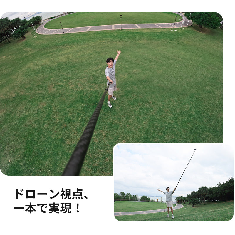 パノラマアクションカメラと組み合わせることで、ドローンによる追跡撮影効果をシミュレート可能。