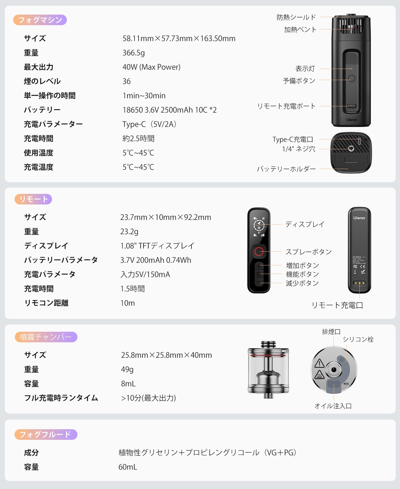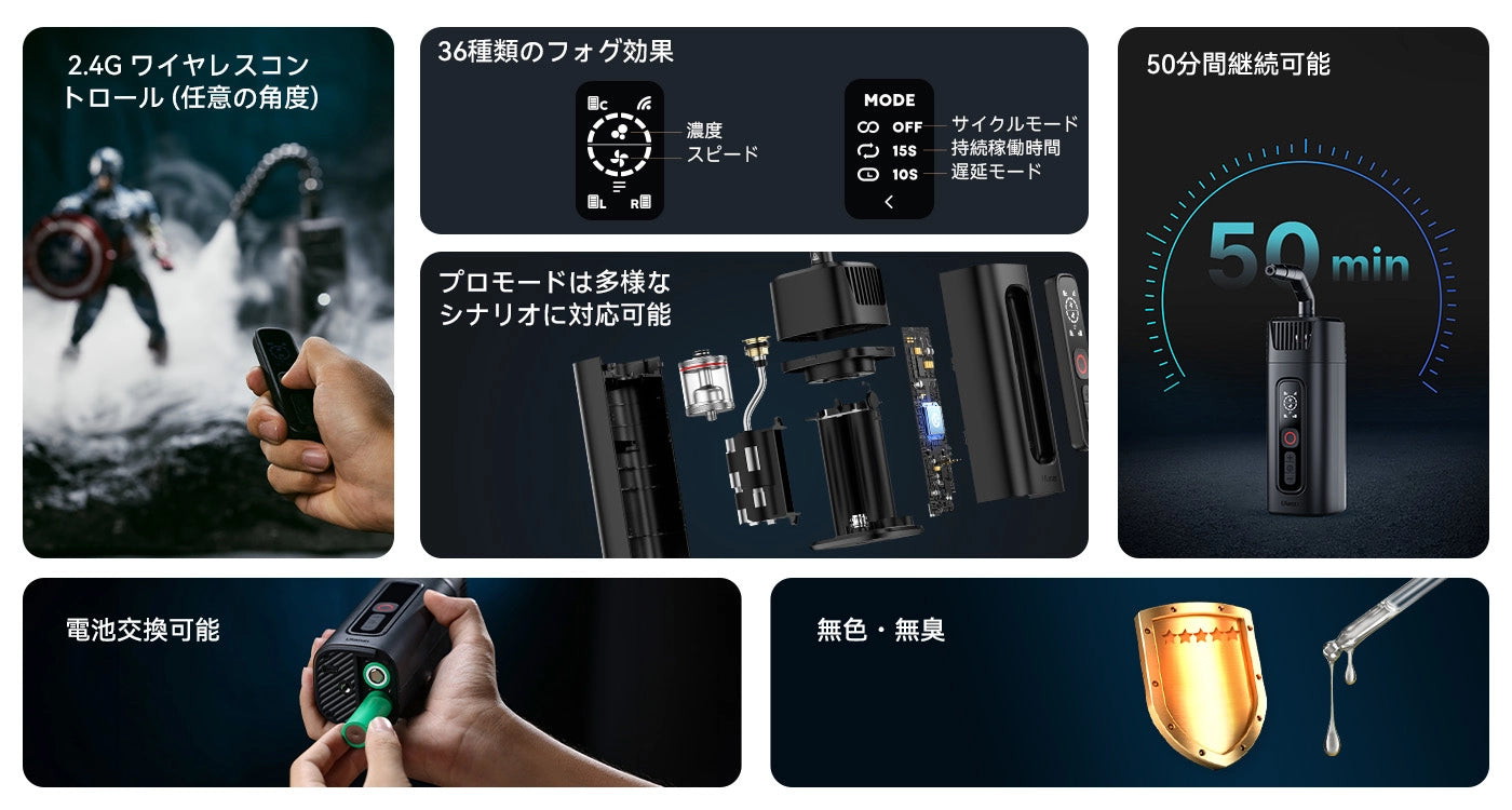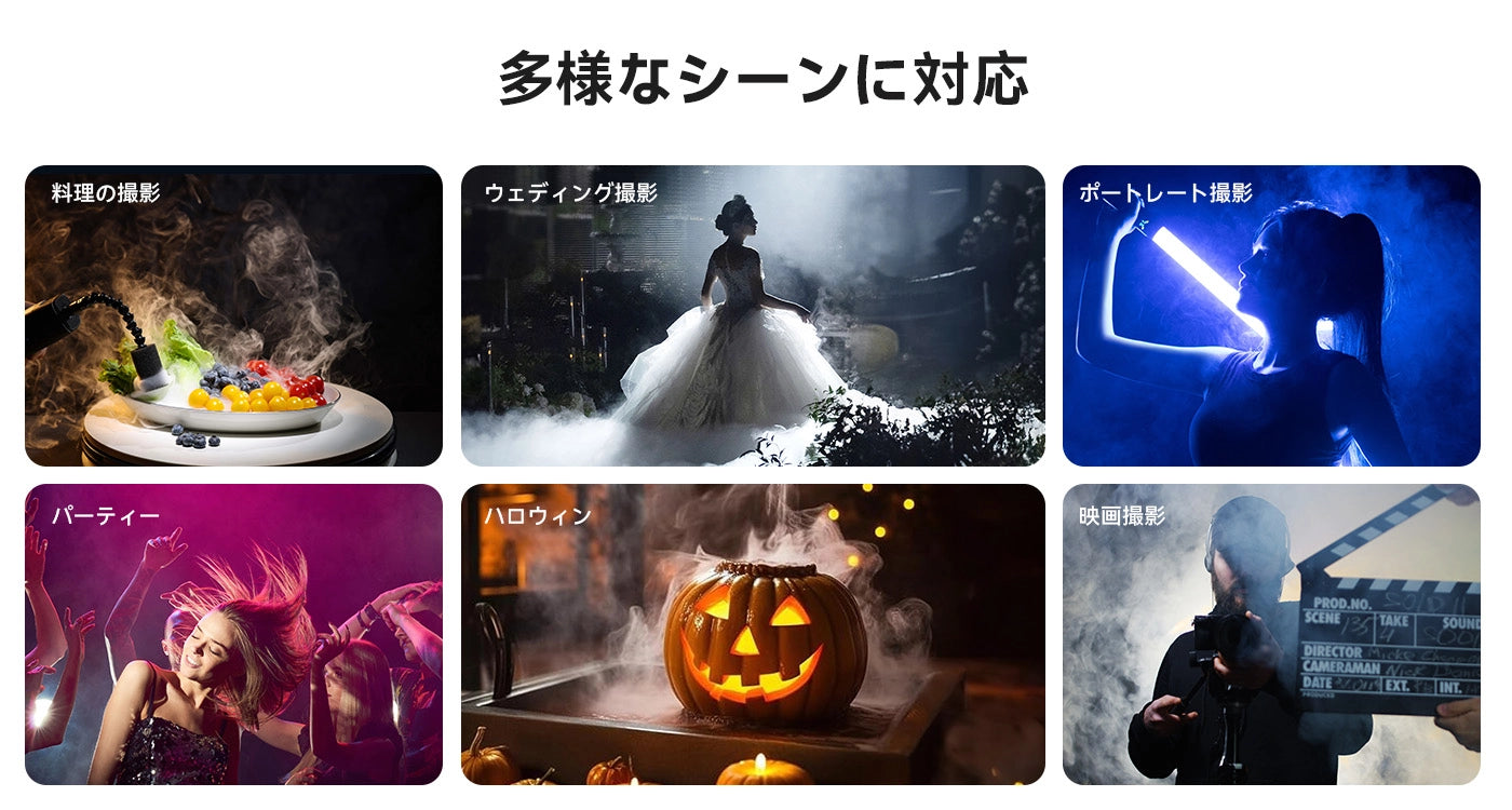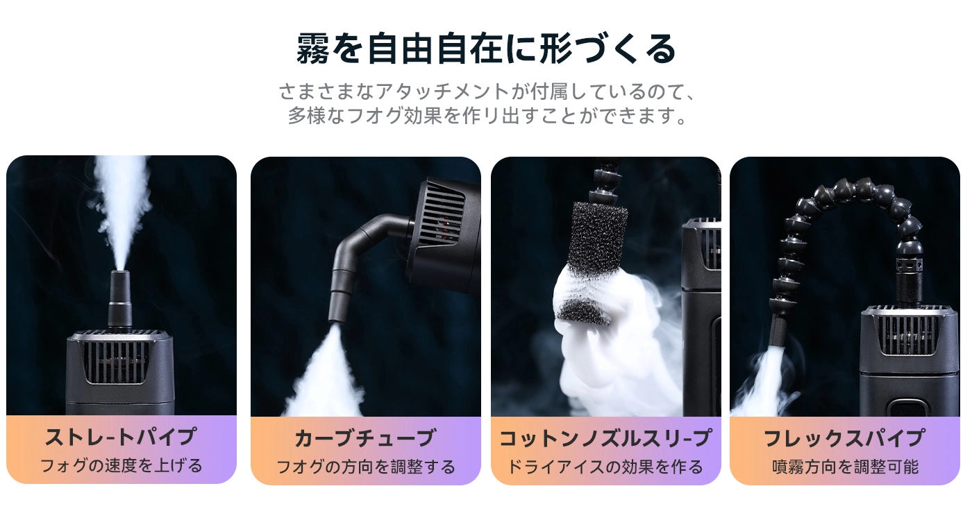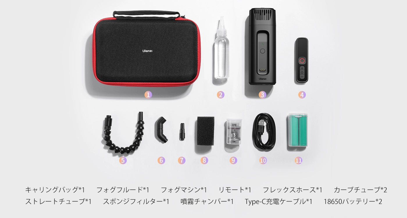 Ulanzi FM01 FILMOG Ace ポータブルフォグマシンはさまざまなアタッチメントが付属しており、異なる強さと速度で合計 36 種類の霧効果を選択できます。フォグマシンを使用して、写真の雰囲気がガラッと変わります!(*安全のため、誤った火災警報を防ぐために霧の量をうまく制御してください。)